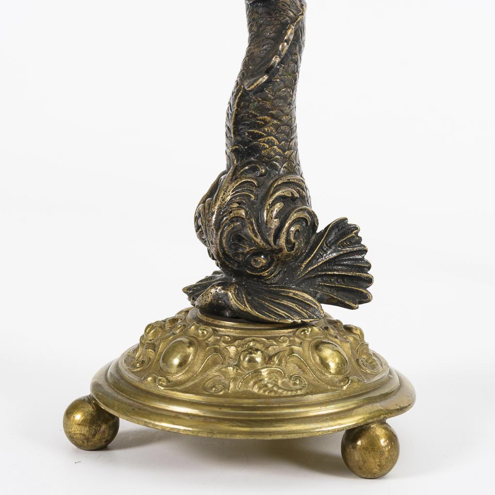 Bronzeleuchter mit reliefiertem Rundfuß, Delfin in barocker Manier als Schaft und Vasentülle über Tropfschale mit Blattkranz. 1 Kugelfußansatz repariert, 1 Schwanzflosse gebrochen.