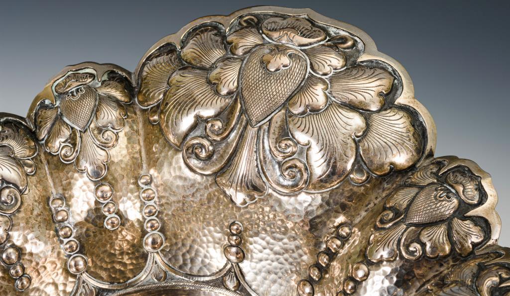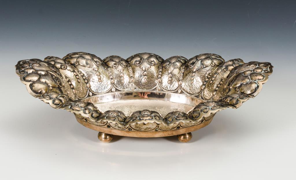 Ovale Schale mit gebuckelter Wandung. Auf 4 Kugelfüßen. Minimal gedellt.