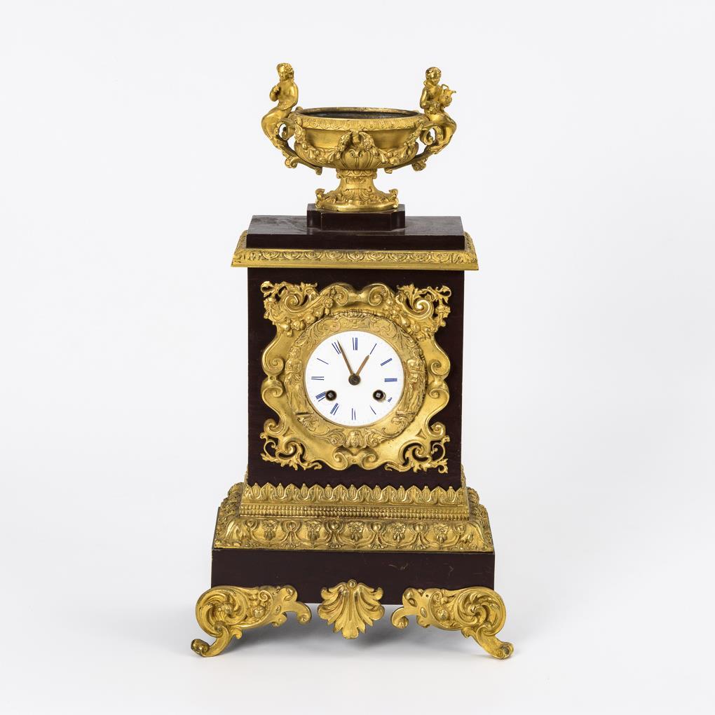 Stelenform mit historistischem Reliefdekor und einer bekrönenden Vase mit figürlichen Henkeln. 1 hinteres Bein und Pendel fehlen, Defekte am Zifferblatt, Retuschen, leichte Kratz- und Altersspuren.