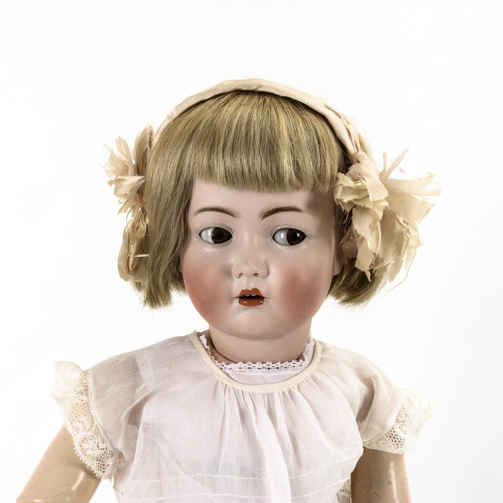 Kurbelkopf, braune Schelmenaugen, blonde Echthaarperücke mit Pagenschnitt. 17-teiliger Toddlerkörper mit Gummihänden und hochgezogenen Knien. Altes weißes Voilekleid. Dazu alte braune Lederschuhe, karierter Mantel, weißes Kleid mit Lochstickerei. Kopf nicht durchleuchtet, ohne sichtbare Defekte. Körper partiell, Hände komplett überstrichen.