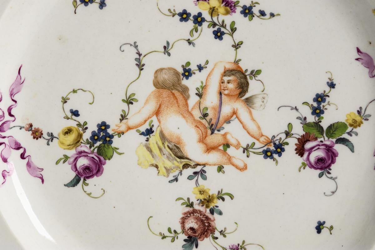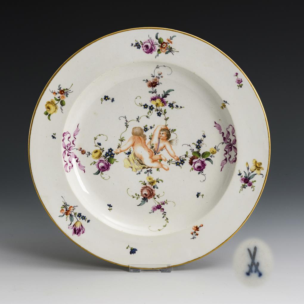 Glatter Teller. Im Spiegel die Darstellung eines von Blütenfestons umrankten Puttenpaares. Etwas berieben.