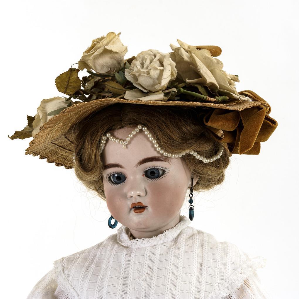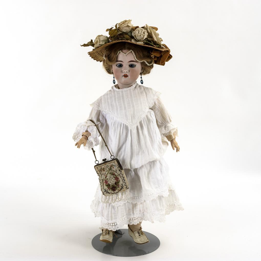 Kurbelkopf, blaue Schlafaugen, Ohrringe, hellbraune Echthaarperücke mit eingeflochtener Perlenschnur. 11-teiliger Gliederkörper. Altes weißes Kleid, Perlentäschchen, Strohhut. Perücke fest: Kopf nicht durchleuchtet, doch ohne sichtbare Defekte. Körper mit reparierten Farbabplatzern.