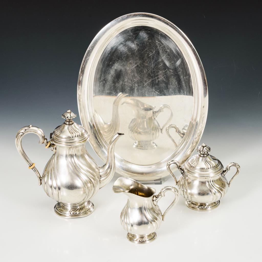 Godronierte Form mit Blütenknauf, Tablett jünger. Gebrauchsspuren, kleine Dellen.