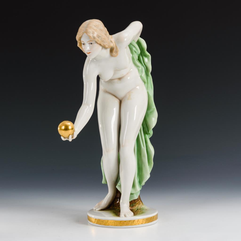 Bewegte Figur einer jungen, eine goldene Kugel werfenden nackten Dame, auf Rundplinthe.