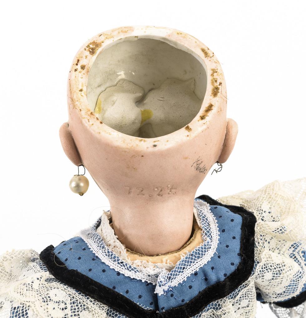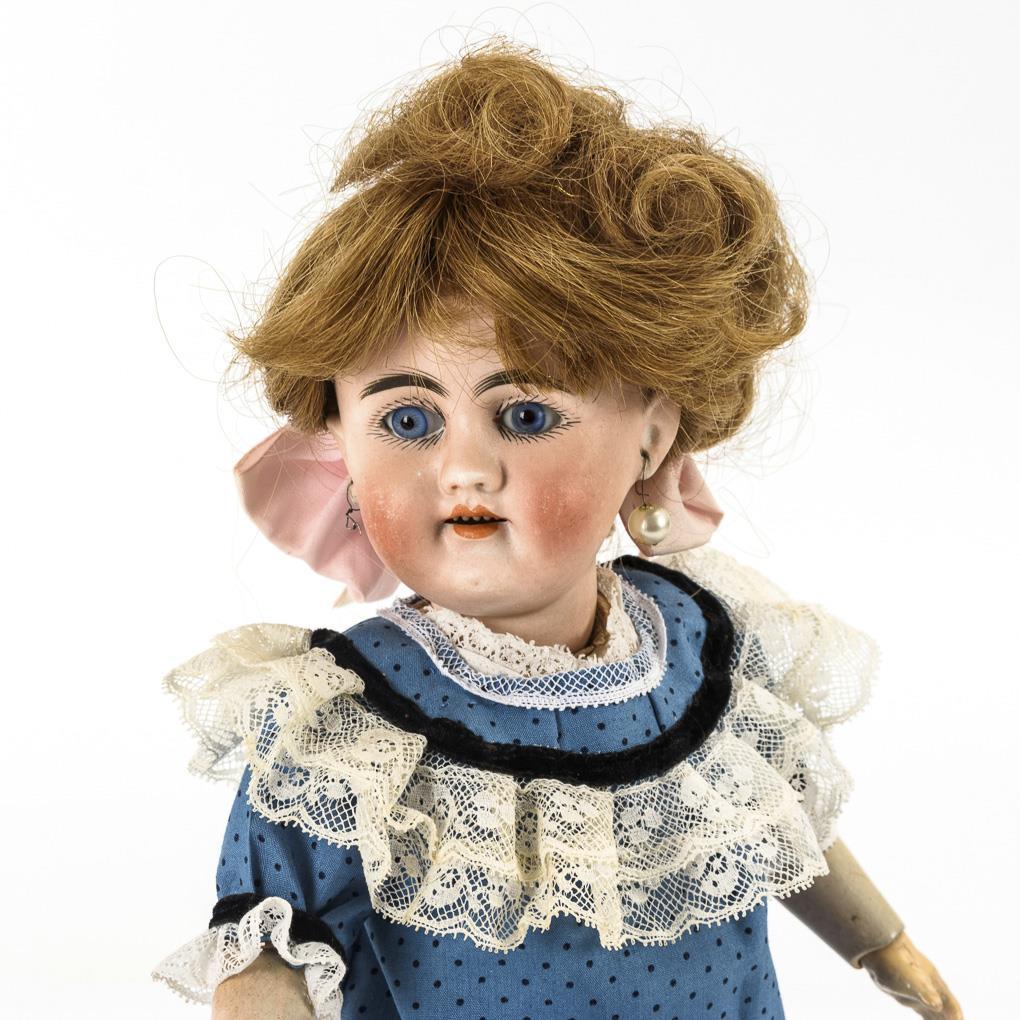 Kurbelkopf, feste blaue Augen, blonde Echthaarperücke. 13-teiliger Gliederkörper. Nachgenähtes blaues Kleid, alte Wachstuchschuhe. Kopf durchleuchtet: ohne Defekte. Arme eventuell ergänzt, 1 Hand mit Ausbesserungen, 1 Ohrring fehlt.