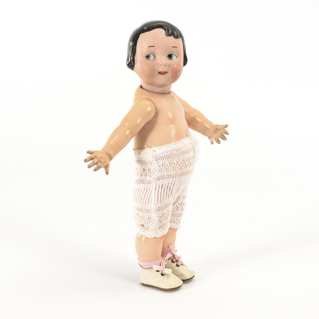 Kurbelkopf, gemalte blaue Schielaugen, modellierte schwarze Pagenfrisur. 5-teiliger Stehpuppenkörper. Rosa Kleid, weiße Schuhe. Ohne sichtbare Defekte.