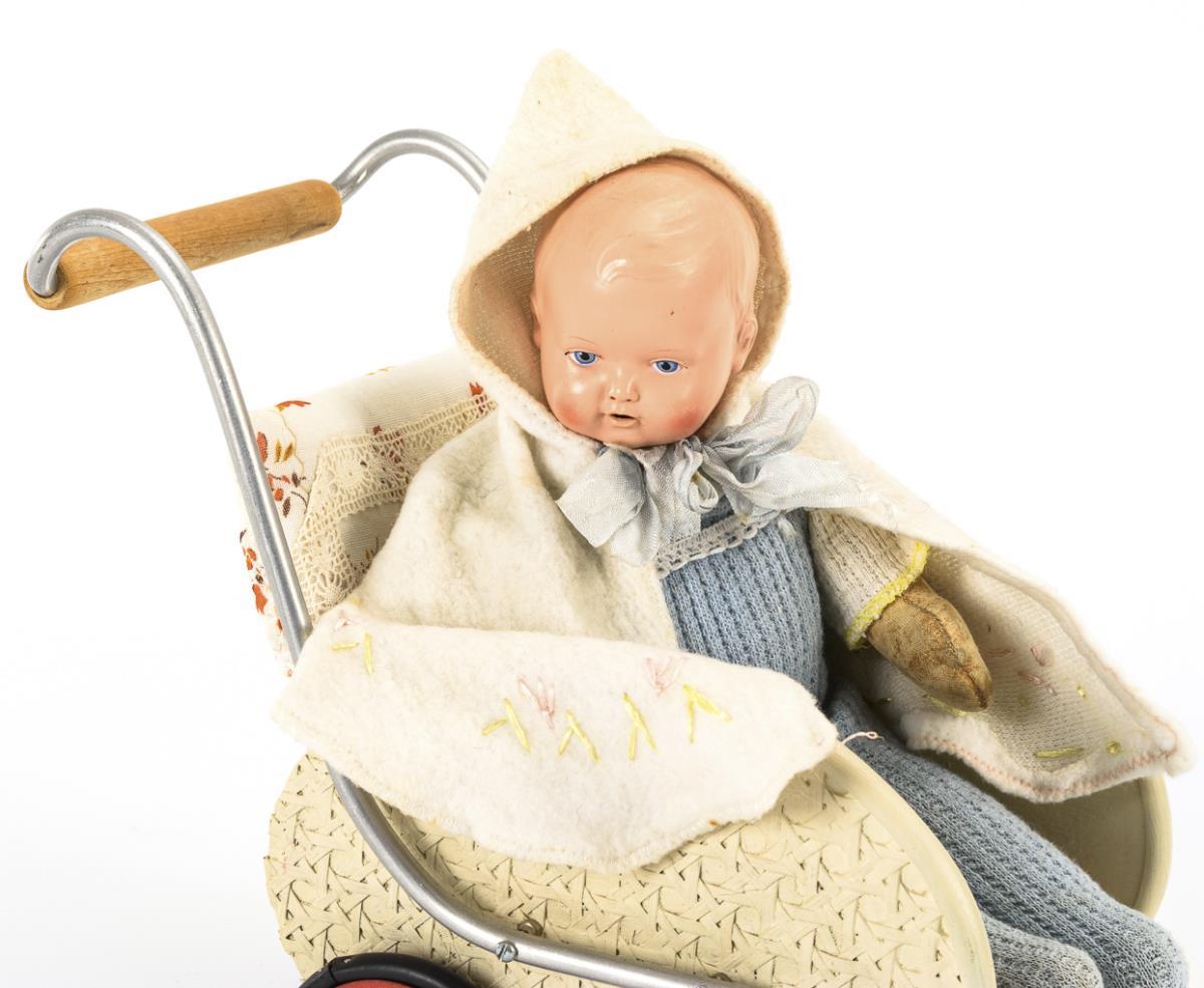 Kleine Stoffpuppe mit Einbindekopf aus Celluloid. Hellblauer Strampler, weiße Pelerine mit Kapuze. In hellem "Sportwagen" (neuerer Eigenbau). Kurzer Riss seitlich am Hals, Körper verschmutzt.