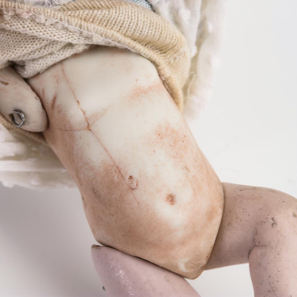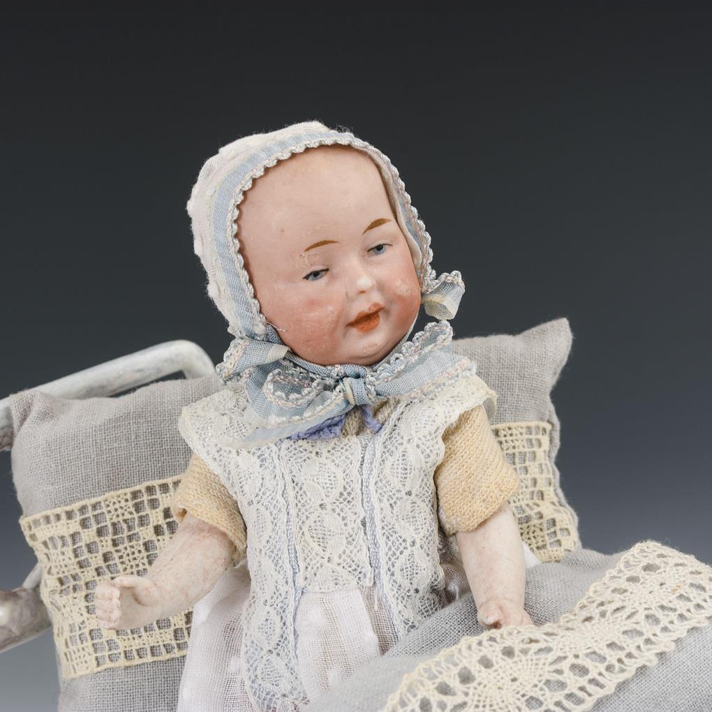 Babypüppchen mit Kurbelkopf, in Art der "Kaiserbabys". In weißem Kleidchen. Dazu weiß gestrichenes Bettchen mit Bettzeug. Glieder wohl ergänzt, Riss im Körper. Bett nachlackiert.