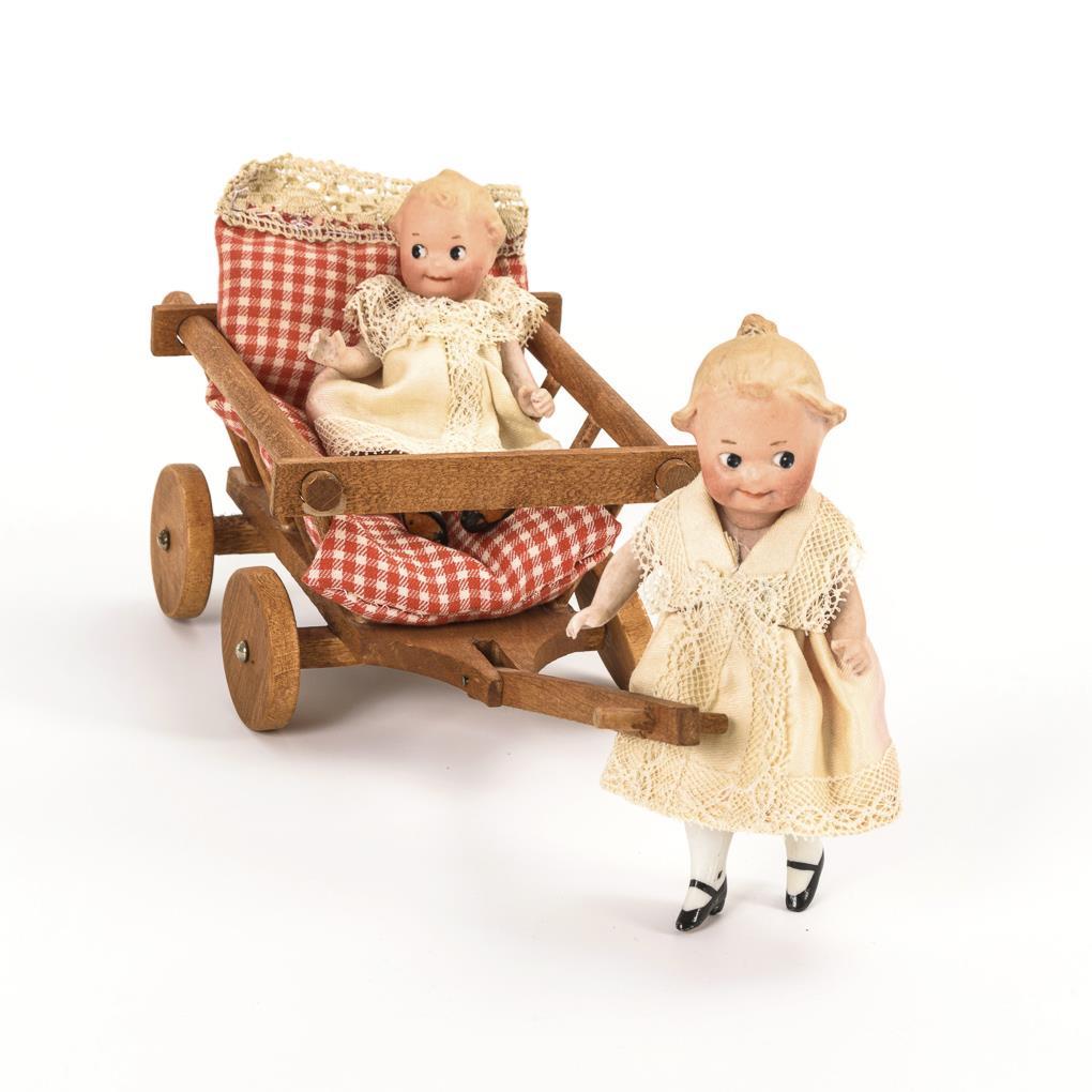 Beide mit Kurbelkopf, gemalten Schielaugen, modellierten Haaren und Schuhen. Helle Kleidchen, gemalte Strümpfe. Als Zugabe neuer Handwagen aus Holz. Neu gespannt, 3 Händchen bestoßen.