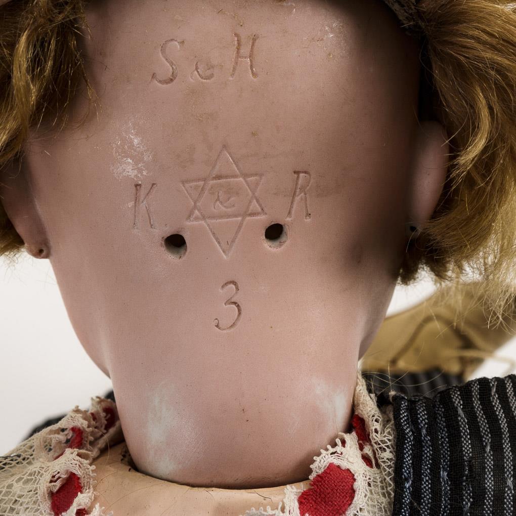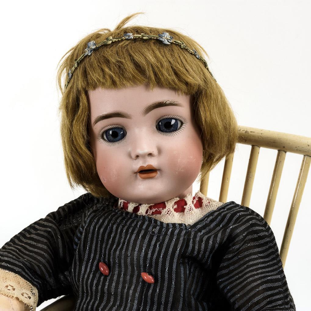 Kurbelkopf, blaue Schlafaugen, Ohrlöcher, blonde Mohairperücke. 15-teiliger Gliederkörper. Schwarzes Streifenkleid mit Korallenknöpfen, dazu dunkles Täschchen mit Perlstickerei. Auf weißem Stuhl (H 39,5 cm). Kopf durchleuchtet: Wange an einer Stelle minimal retuschiert, linkes Ohrläppchen restauriert, 1 Augenbraue berieben. 2 Finger repariert, 1 Schuh fehlt.