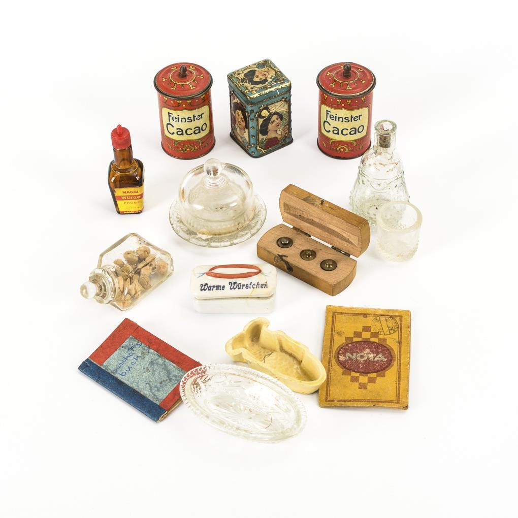 Ca. 14 Teile, darunter 5x Glas, 3 alte Blechdosen, Würstchendose, Maggi-Flasche etc.