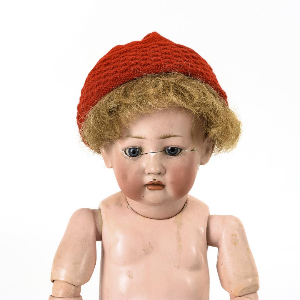 15-teiliger Gliederkörper mit provisorisch geklebtem Kurbelkopf. Dazu blonde Kunsthaarperücke und 6 Teile Kleidung.