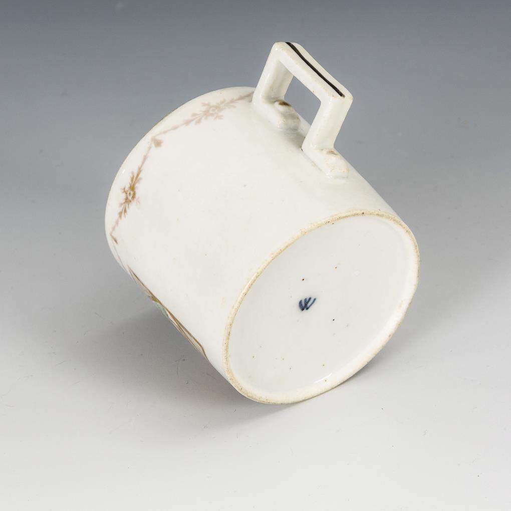 Zylindertasse mit gewinkeltem Henkel. Schauseitig eine goldgerahmte Rechteckkartusche mit der Darstellung einer Schlossansicht. Gold berieben.