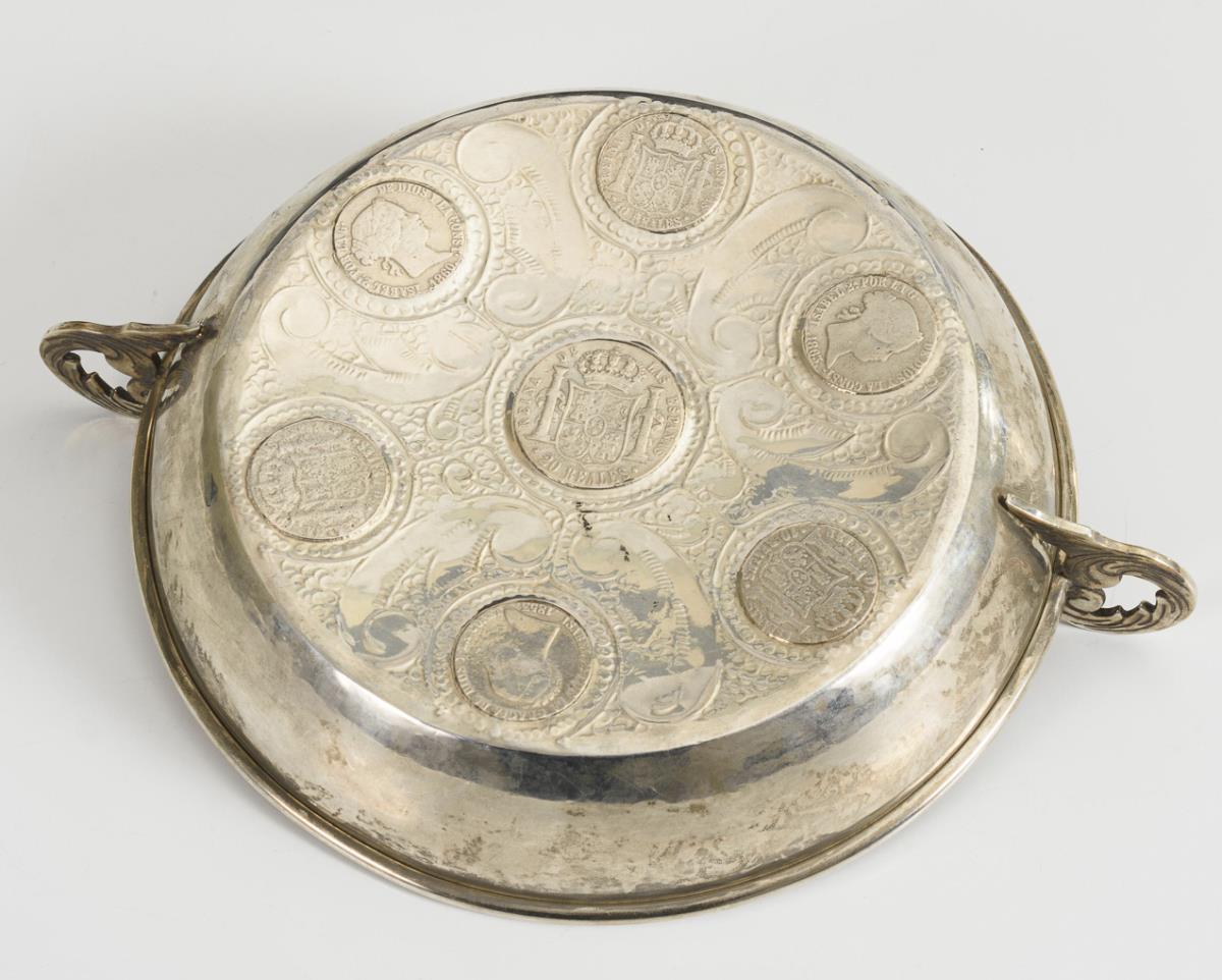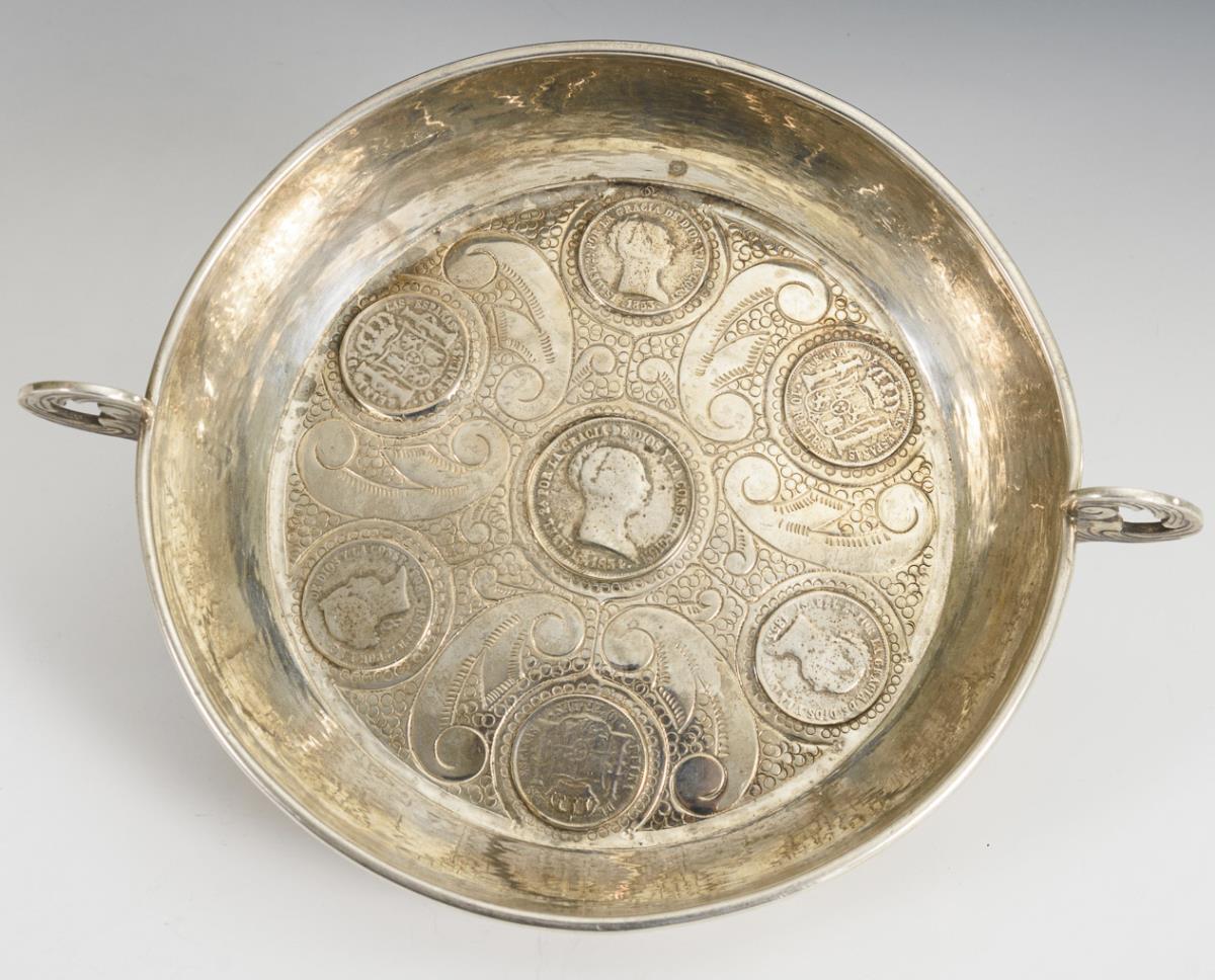 Runde Henkelschale mit verschiedenen spanischen Münzen, teils datiert (1850er/60er Jahre). Etwas berieben, leicht gedellt.