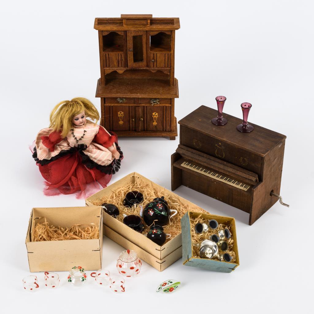 Jugendstil-Büfett aus Eichenholz, Klavier mit aufgemalter Tastatur und inliegender Spieluhr, Porzellankopf-Püppchen mit Nadelkissen-Körper, 3 Miniatur-Service aus Glas (darunter 1x sogenanntes "Bauernsilber"). Teils kleine Defekte.