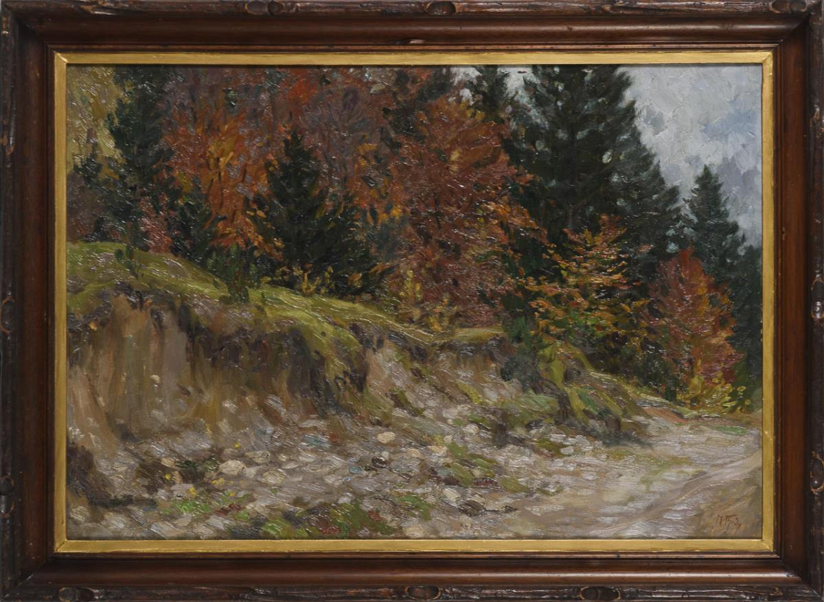 Weg am Waldhang mit den herbstlich verfärbten Bäumen unter bewölktem Himmel.