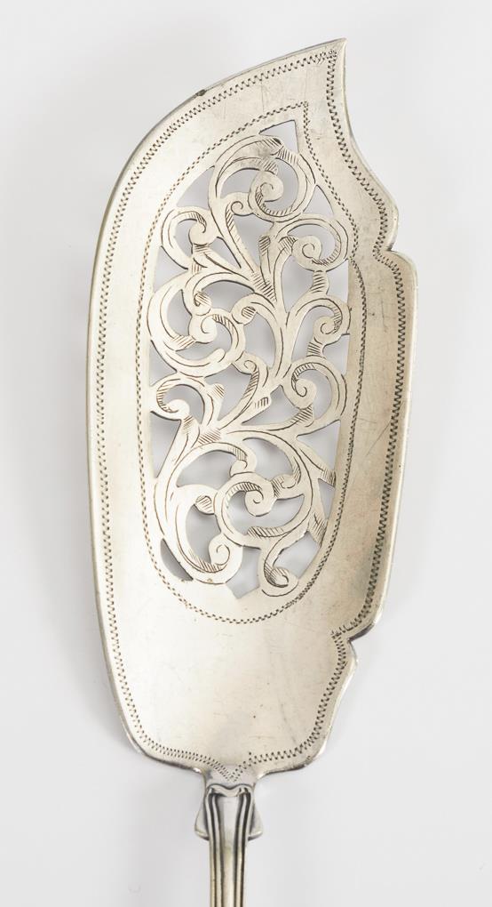 Fischmesser, Salatlöffel und versilberter Gebäckheber. Fischmesser und Löffel mit russischen Importmarken. Leichte Gebrauchsspuren.