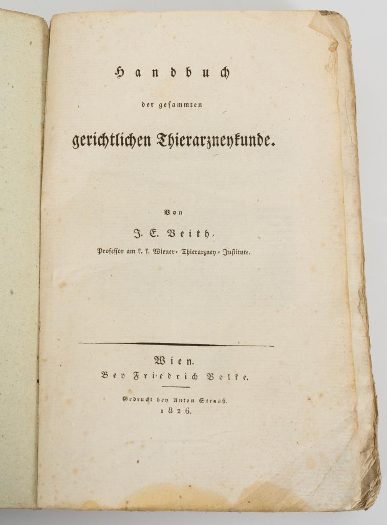 Kersting, J. A.: "Nachgelassenen Manuscripte über die Pferde-Arzney-Wissenschaft", Marburg 1793, in der neuen Akademischen Buchhandlung. Dritte mit Anmerkungen und Zusätzen vermehrte wohlfeile Auflage. 8, 258 Seiten. Fester Pappeinband und Rotschnitt, 18 x 11 cm. / Veith, J. E.: "Handbuch der gesammten gerichtlichen Thierarzneykunde", Wien 1826, bei Friedrich Volke, gedruckt bei Anton Strauß. 20, 552 Seiten. Unbeschnittenes Druckexemplar, Seiten bestoßen. 22 x 14 cm. / von Erdelyi, Michael: "Grundlinien der Muskellehre des Pferdes, mit Berücksichtigung der Abweichung bey den übrigen Haussäugethieren". Wien 1839, gedruckt und im Verlage bey Carl Gerold. 2. Auflage. 4, 100 Seiten, Broschur mit Altersspuren. 21,5 x 13 cm.