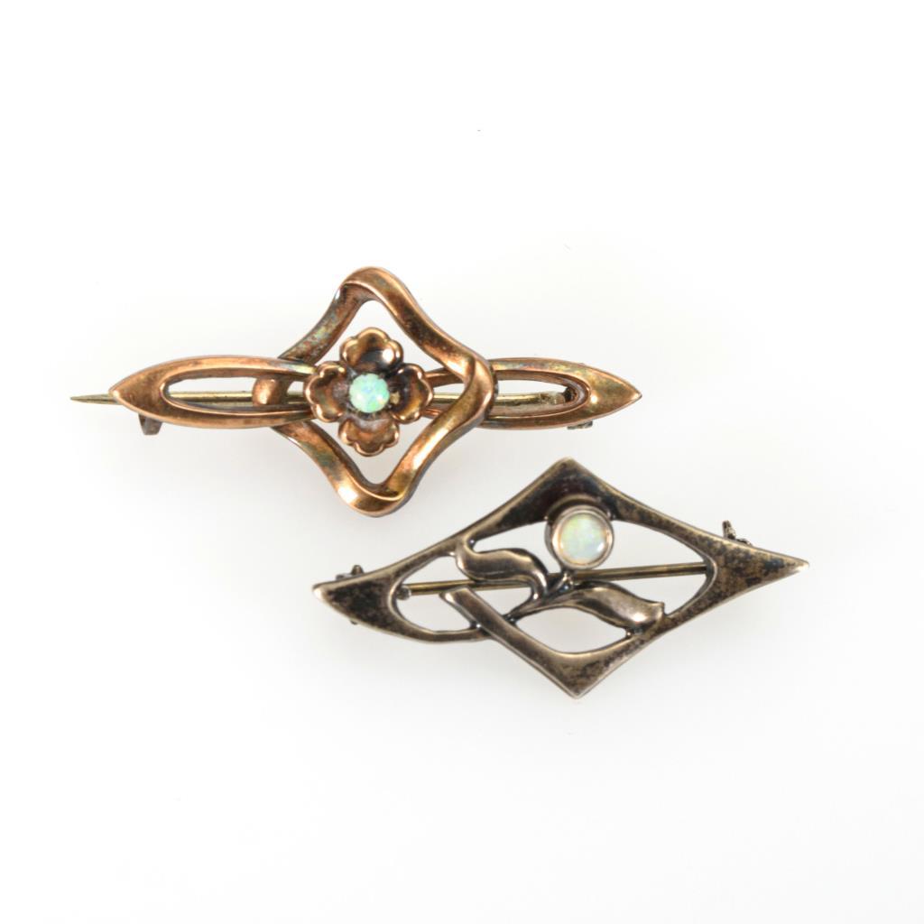 Stiltypische Broschen mit kleinem Opalcabochon. Hakenverschluss, Kugelhaken.