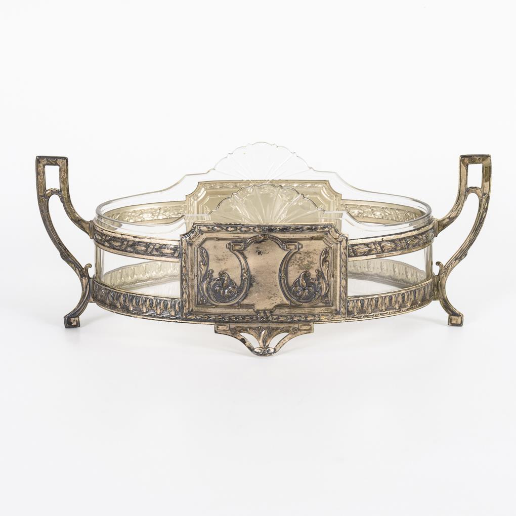Ovale Jardiniere mit hochgezogenen Handhaben. Umlaufende Blattfriese halten beidseitig ein Kartuschenfeld ohne Gravur. Originaler Glaseinsatz mit Fächerzier. Berieben.