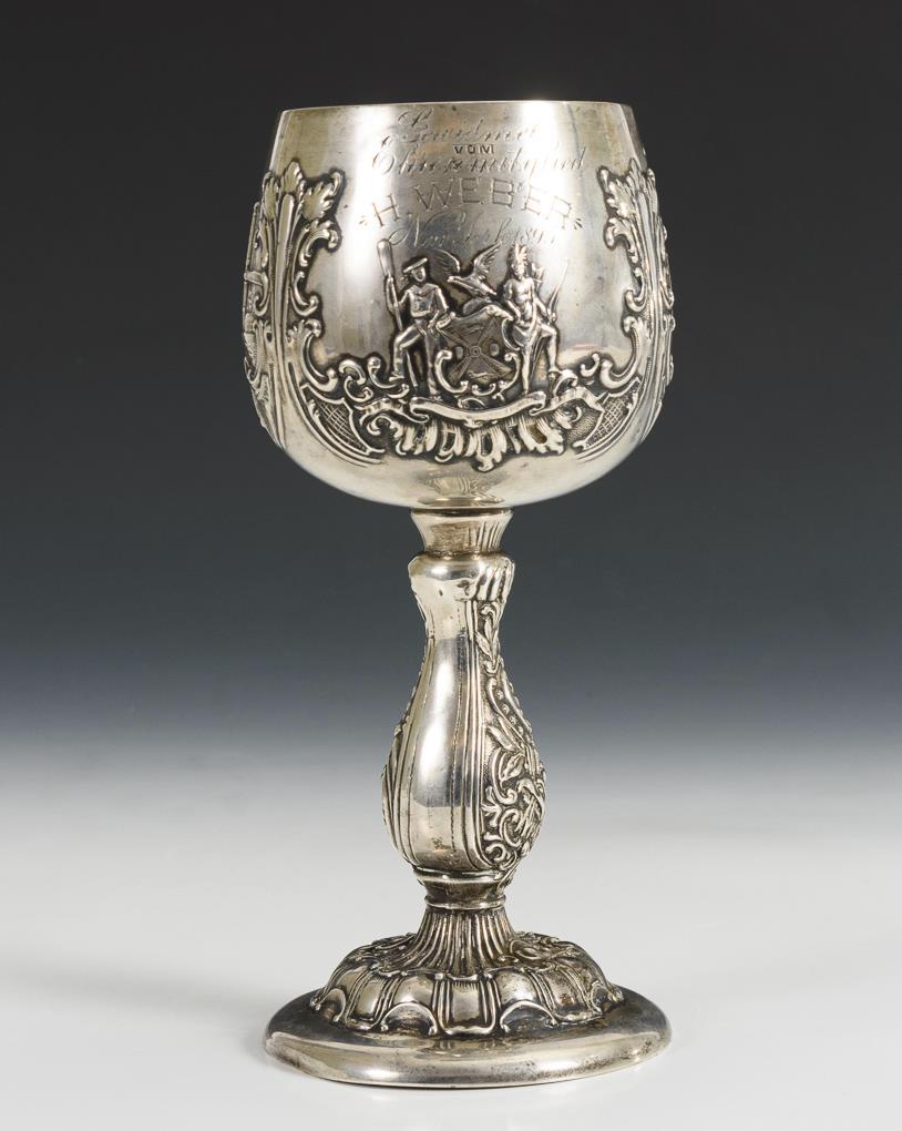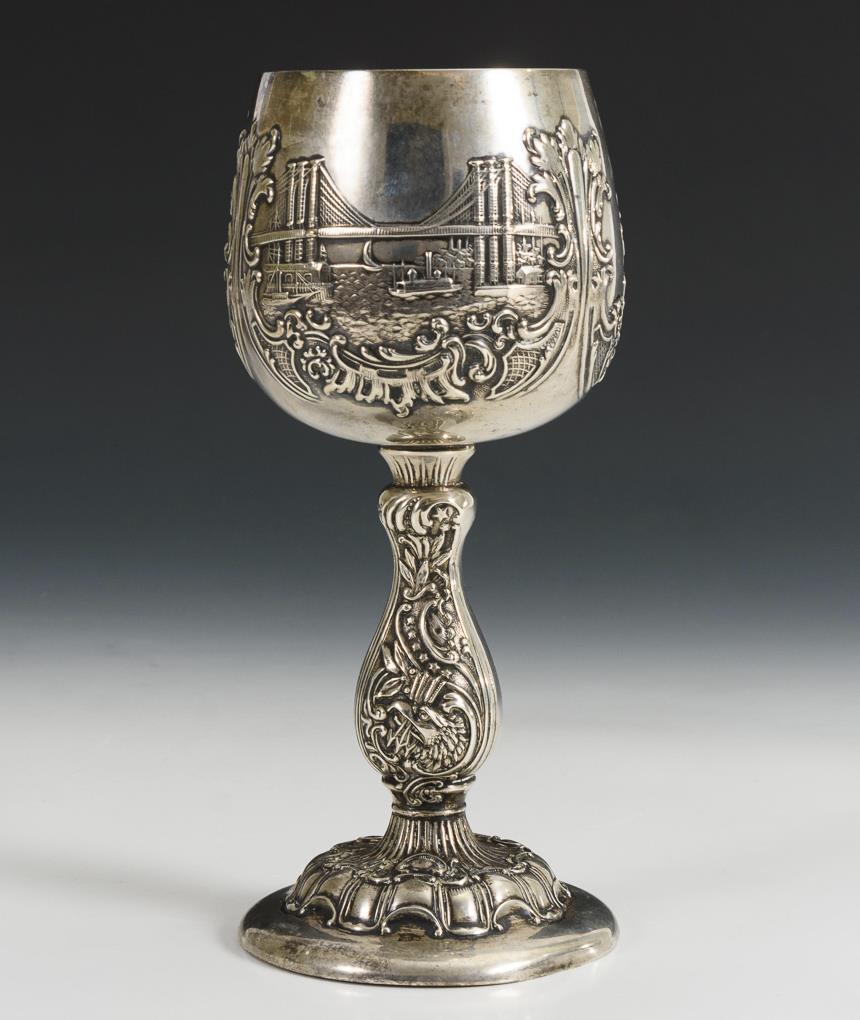 Reich reliefierter Silberkelch mit Brooklyn-Brigde, Widmungsgravur und Reliefschrift "Erstes Nationales Bundesschiessen New York 1895". Am Stand gedellt.