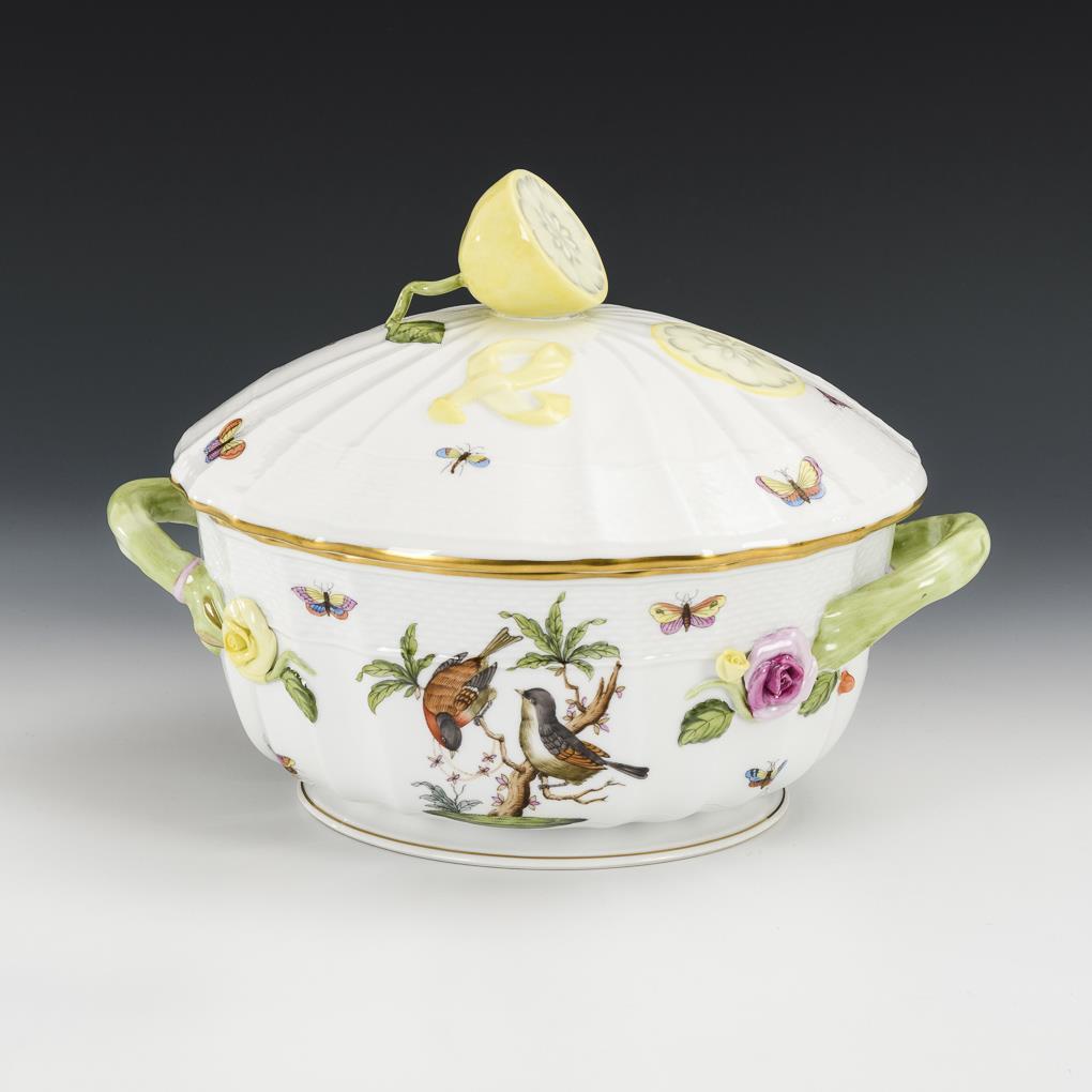 Form "Altozier". Terrine mit Asthandhaben und Zitronenknaufdeckel. Umlaufend Vogel- und Insektenmalerei.