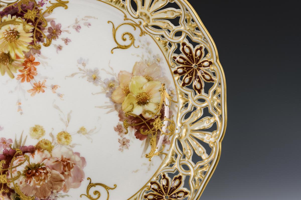 Modell "Neugerippt, Durchbruch neue Sorte". Teller mit Palmetten- und Sterndurchbruch auf der Fahne. Im Spiegel drei reliefgoldverzierte Blumenbuketts in Weichmalerei mit Pfingstrosen, Anemonen und Astern, auf der Fahne Fonds in Braun, Creme und Hellgelb.