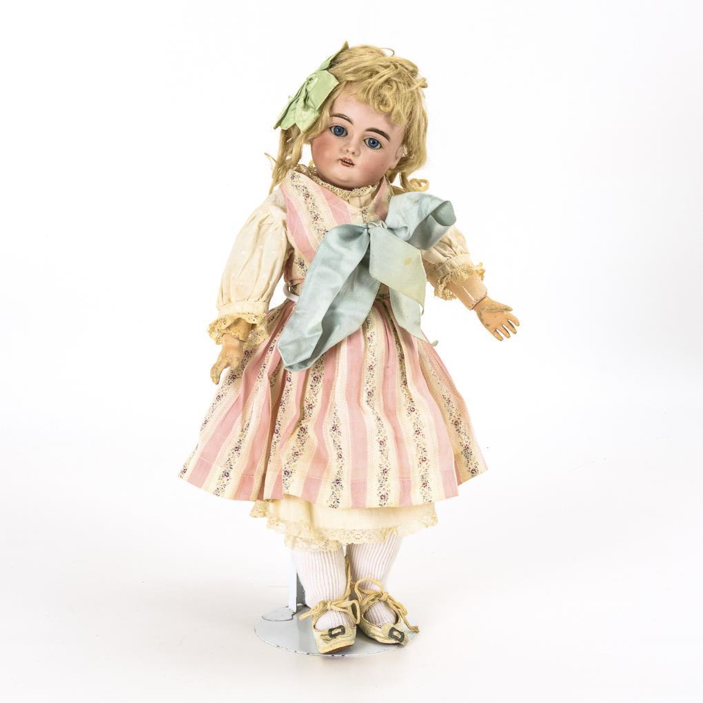 Kurbelkopf, blaue Schlafaugen, blonde Mohairprücke. 15-teiliger Gliederkörper. Rosa-weiß gestreiftes Kleid, weiße Lederschuhe. Kopf durchleuchtet: ohne Defekte. Kleine Farbdefekte am Körper, 1 Finger repariert.