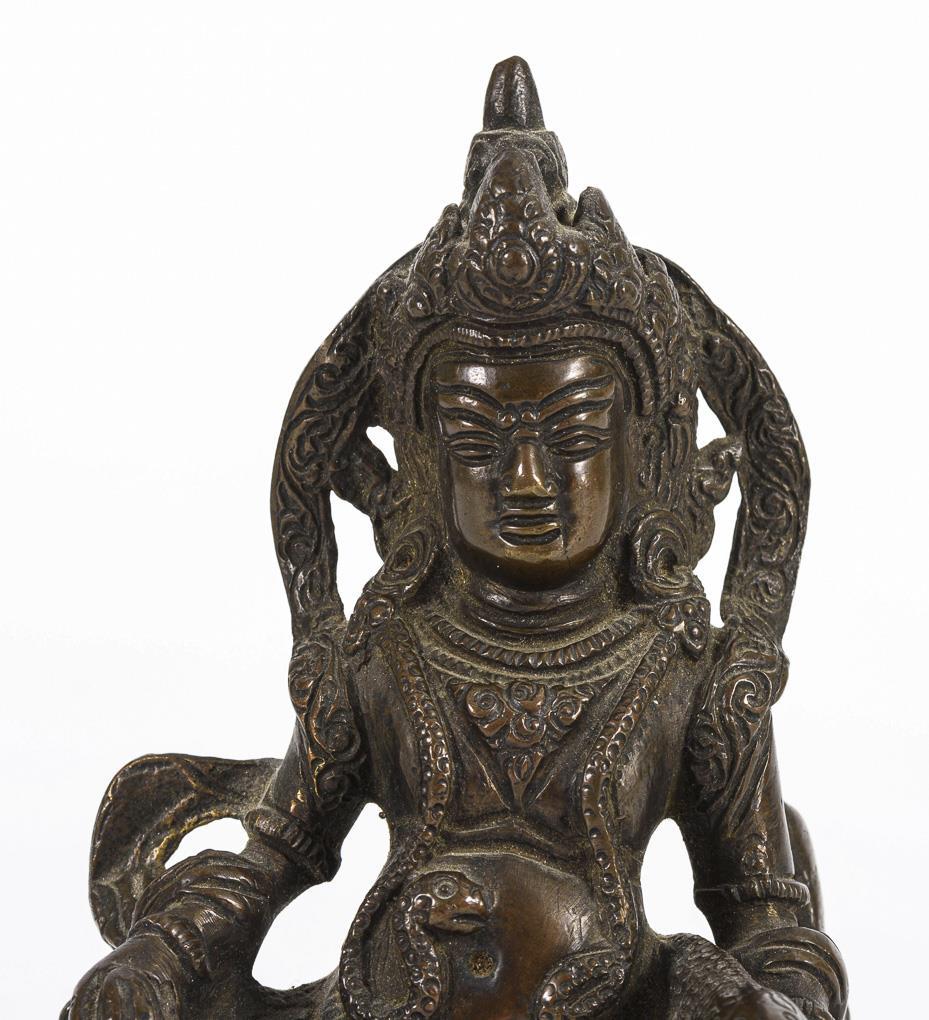 Gekrönte Figur im gelösten Sitz auf doppeltem Lotosthron, eine Schlange um den Hals hängend, eine größere an der Seite. Durch Schmuckband wird eine Art Mandorla geformt. Boden geschlossen.