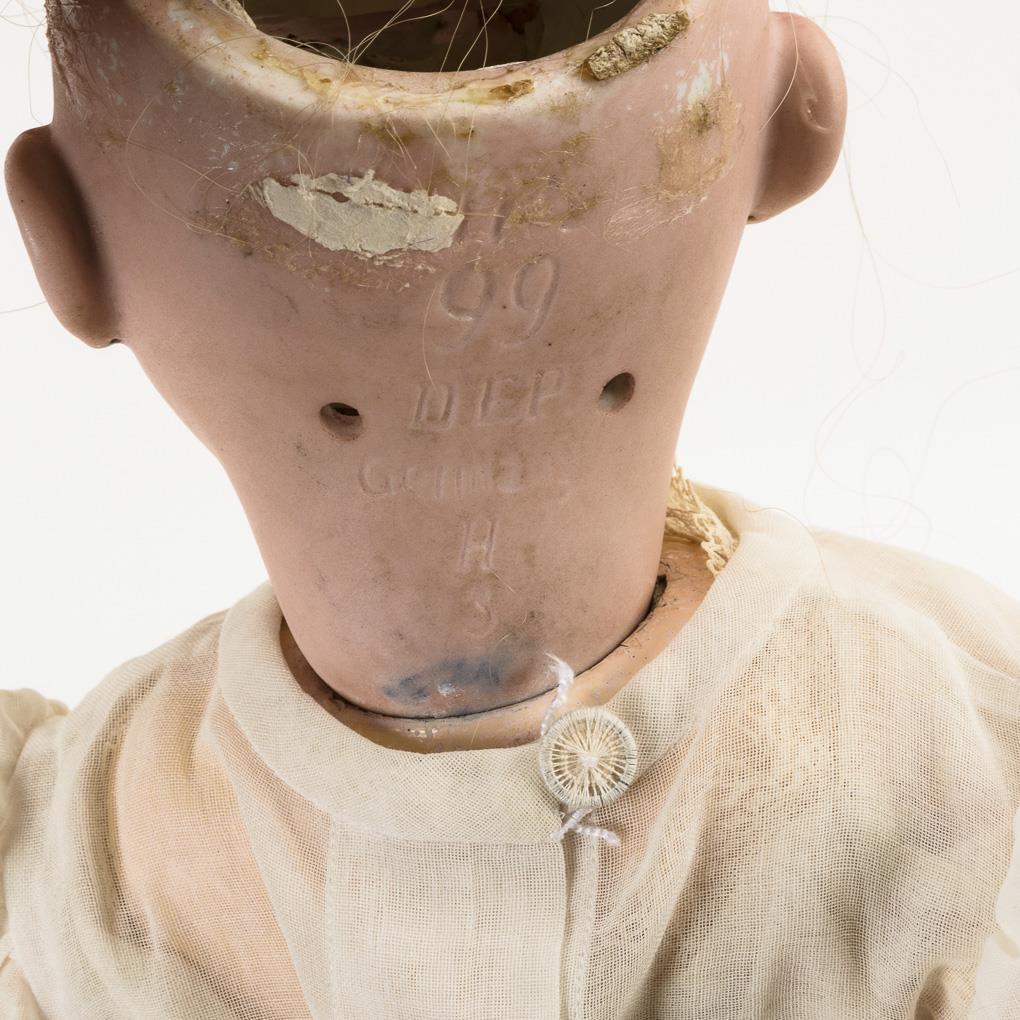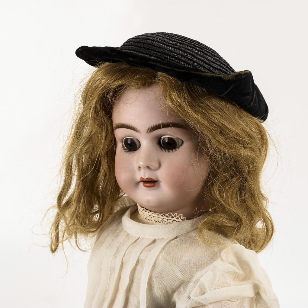 Kurbelkopf, braune Schlafaugen, Ohrlöcher, blonde Echthaarperücke. 15-teiliger Gliederkörper. Weißes Kleid, alte Unterwäsche, schwarze Schuhe, schwarzer Samthut. Kopf durchleuchtet: ohne Defekte, minimaler Perückenpull.