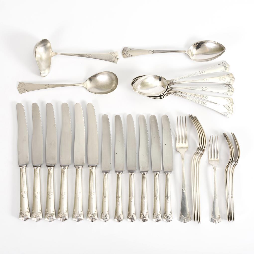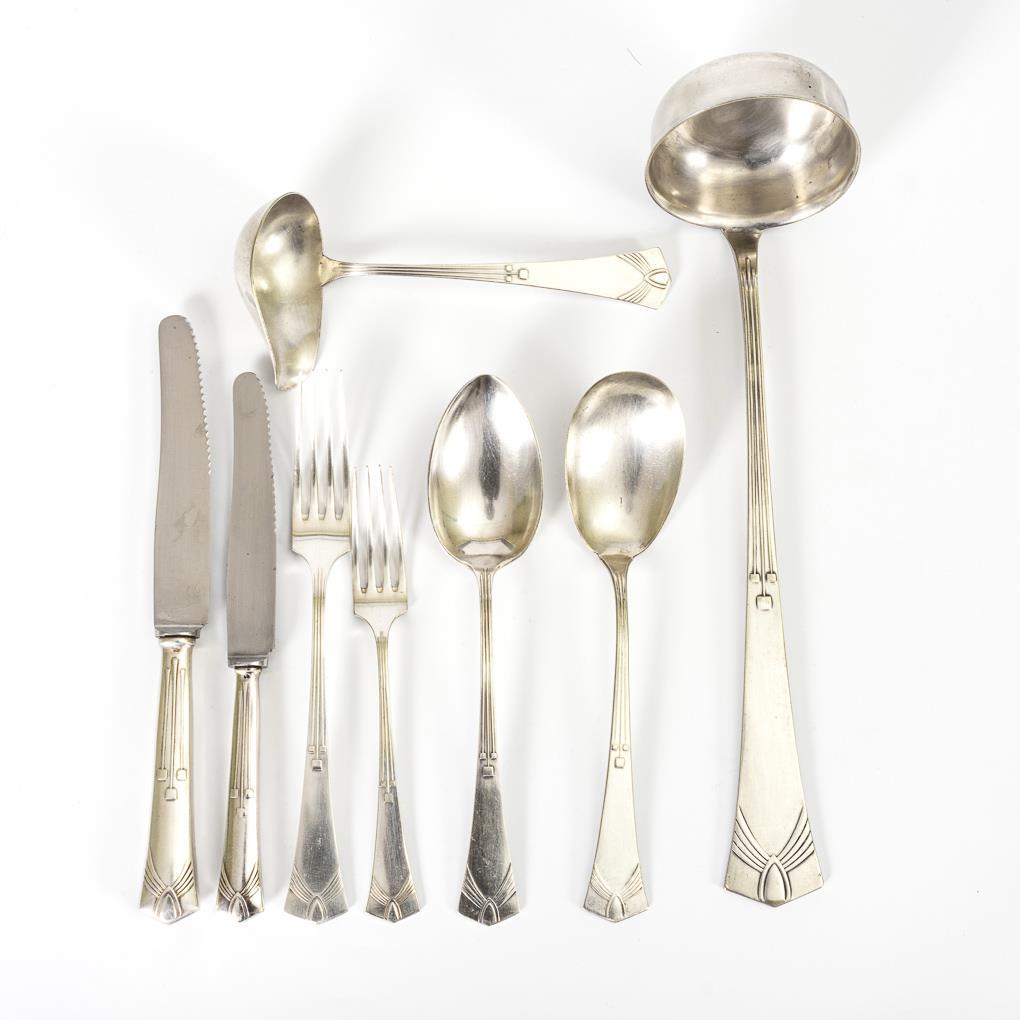 Geometrisch reliefiertes Speisebesteck für 6 Personen: je 6 Menügabeln und -messer, je 6 Dessertgabeln und -messer, 6 Suppenlöffel und 3 Vorlegeteile. 1 Löffel mit Monogrammgravur "EZ". Minimale Gebrauchsspuren.