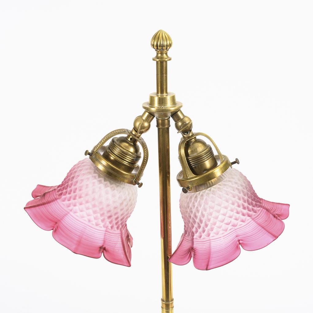 Strahlenförmiger Rundfuß, schlanker Balusterschaft mit Stabaufsatz, 2 schwenkbare Fassungen mit mattierten Glasschirmen. Neu verkabelt mit 12-V-Trafo und LED-Strahlern.