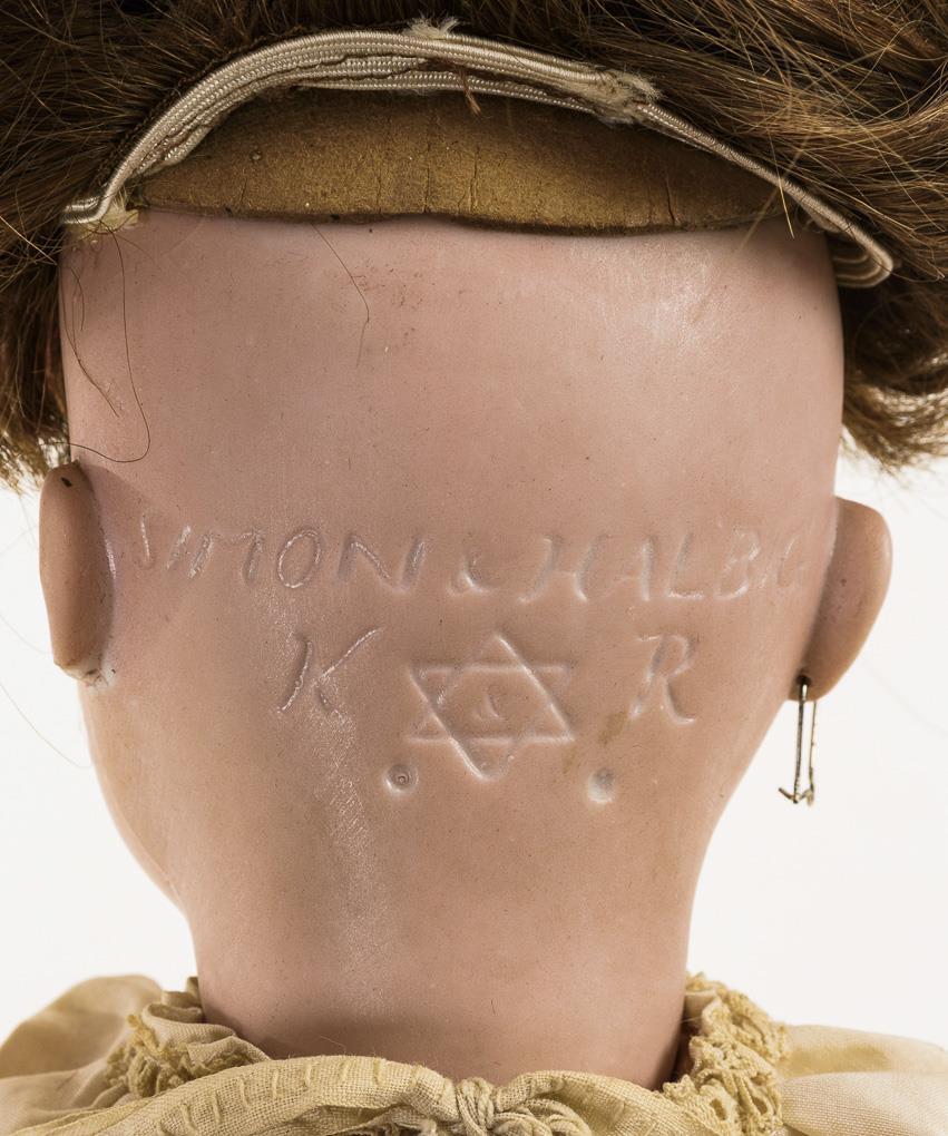 Kurbelkopf, blaue Schlafaugen, Ohrlöcher, braune Echthaarperücke. 5-teiliger Stehpuppenkörper. Helles Kleid, Stoffschuhe. An der Kopfkrone Brandriss mit kurzem Haarriss, Farbdefekt am rechten Fuß.