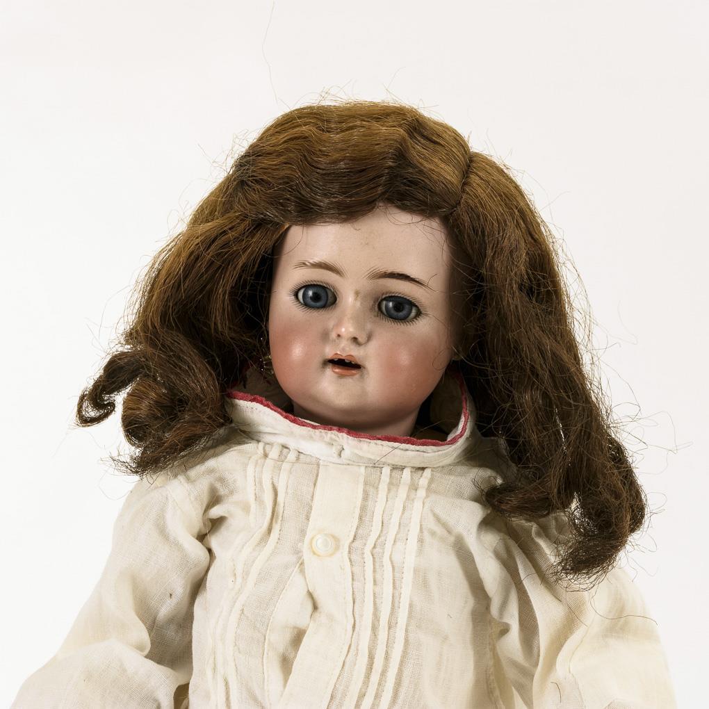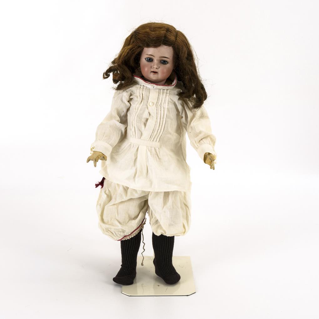 Kurbelkopf, blaue Schlafaugen, 1 Ohrring, braune Kunsthaarperücke. 15-teiliger Gliederkörper. Weiß bekleidet, braune Strümpfe. Kopf durchleuchtet: ohne Defekte, lediglich 2 Chips an den Ohrlöchern, 1 Zahn fehlt. Körper teils übermalt, mit kleinen Defekten, 1 Finger fehlt.