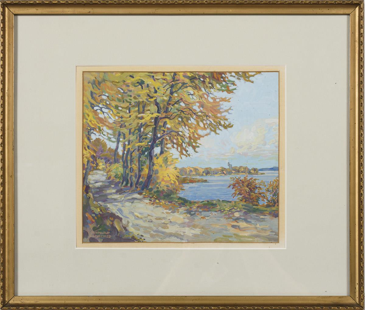 Sonniger Küstenblick mit schmalem Weg unter herbstlich verfärbten Bäumen. Kratzer.
