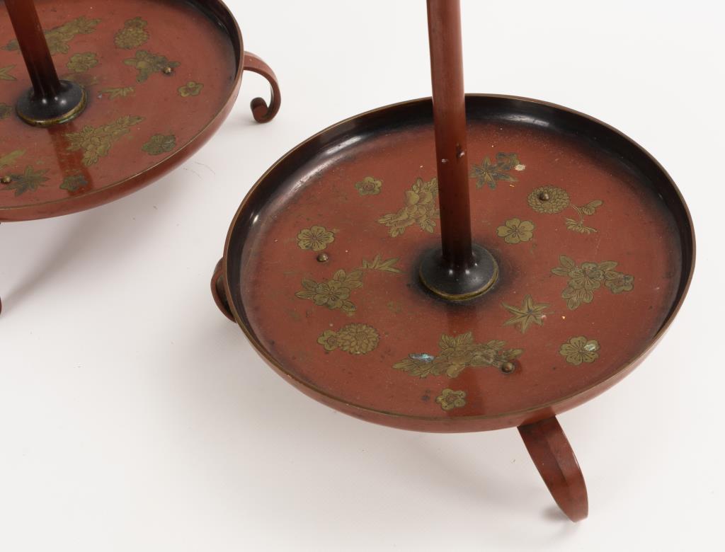 Hohe Bodenleuchter mit floraler Zier am Schalenfuß, Schaftstab mit Haken sowie Wachsteller mit Kerzenhalterung. Berieben.