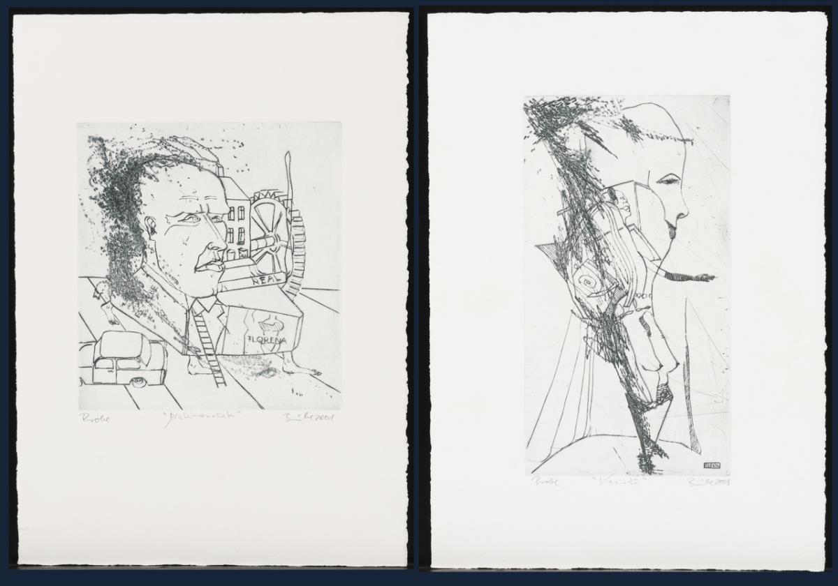 "Varieté", Platte: 26 x 14 cm, Blatt: 38 x 27 cm, Probedruck, 2001 | "Blick zurück", Platte: 20 x 18 cm, Blatt: 38 x 27 cm, Probedruck, 2001.