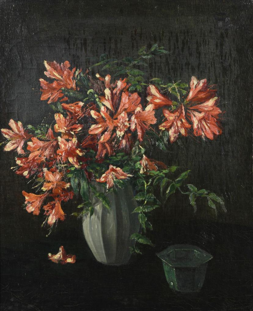 Blumen mit farbkräftigen Blüten in einer hellen Vase vor dunklem Hintergrund. Altersspuren.