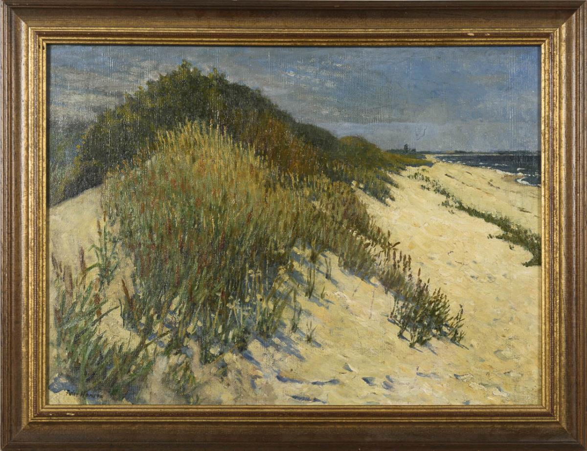 Bewachsene Dünen im Sonnenschein unter blauem Himmel. Leichte Altersspuren.