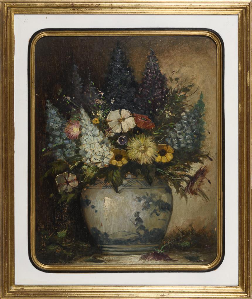 Verschiedene Blumen in einem bunten Strauß in Keramikvase. Zwei kleine Defekte.