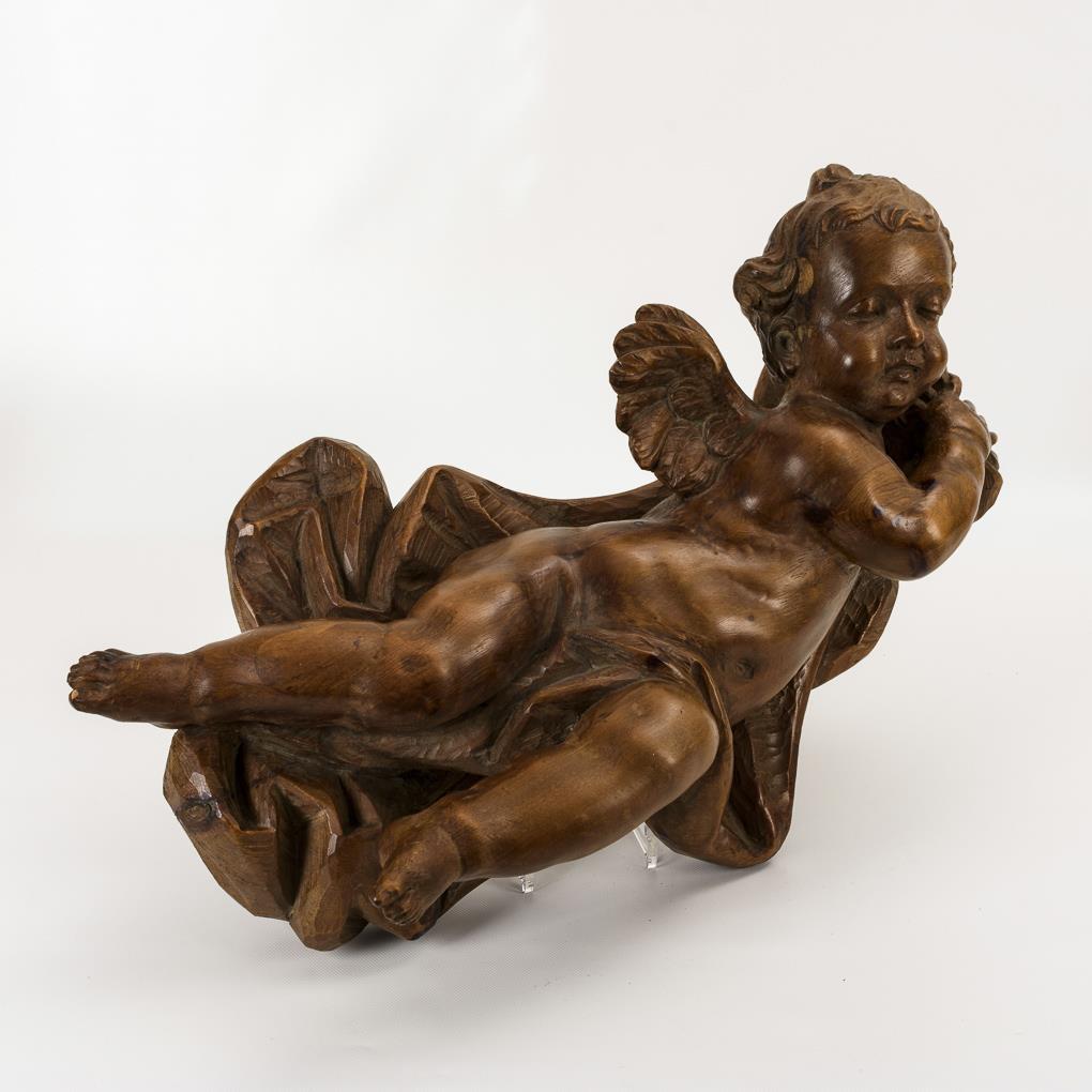 Annähernd vollplastische Figur des nackten Puttos, der in dynamischer Bewegung vor dem Tuch als Hintergrund gleichsam schwebt. Minimale Alters-/Gebrauchsspuren.