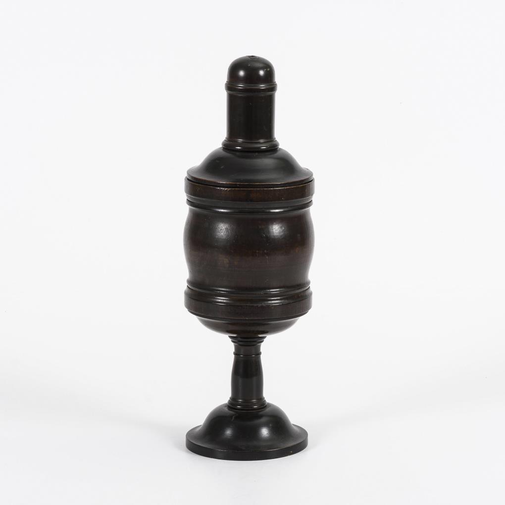 Pokalartiger Drechselbehälter mit Fidibusbehälter auf dem Passdeckel; innen Binnendeckel aus Zinn. Bekrönung fehlt, Binnendeckel mit Kerbe.