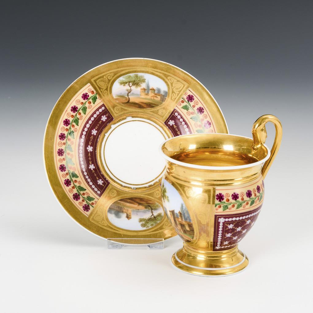 Gefußte Glockentasse mit Schwanenkopfhenkel. Teils ornamental radierter Goldfond, beigefarbener und bordeauxfarbener Teilfond mit Floralmalerei, schauseitig auf der Tasse sowie auf der Untertasse ein Medaillon mit einer idealen Landschaft mit Architektur und teils mit Figurenstaffage. Minimaler Goldabrieb im Untertassenspiegel.