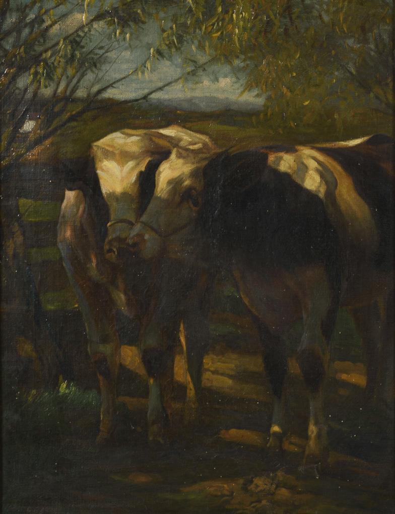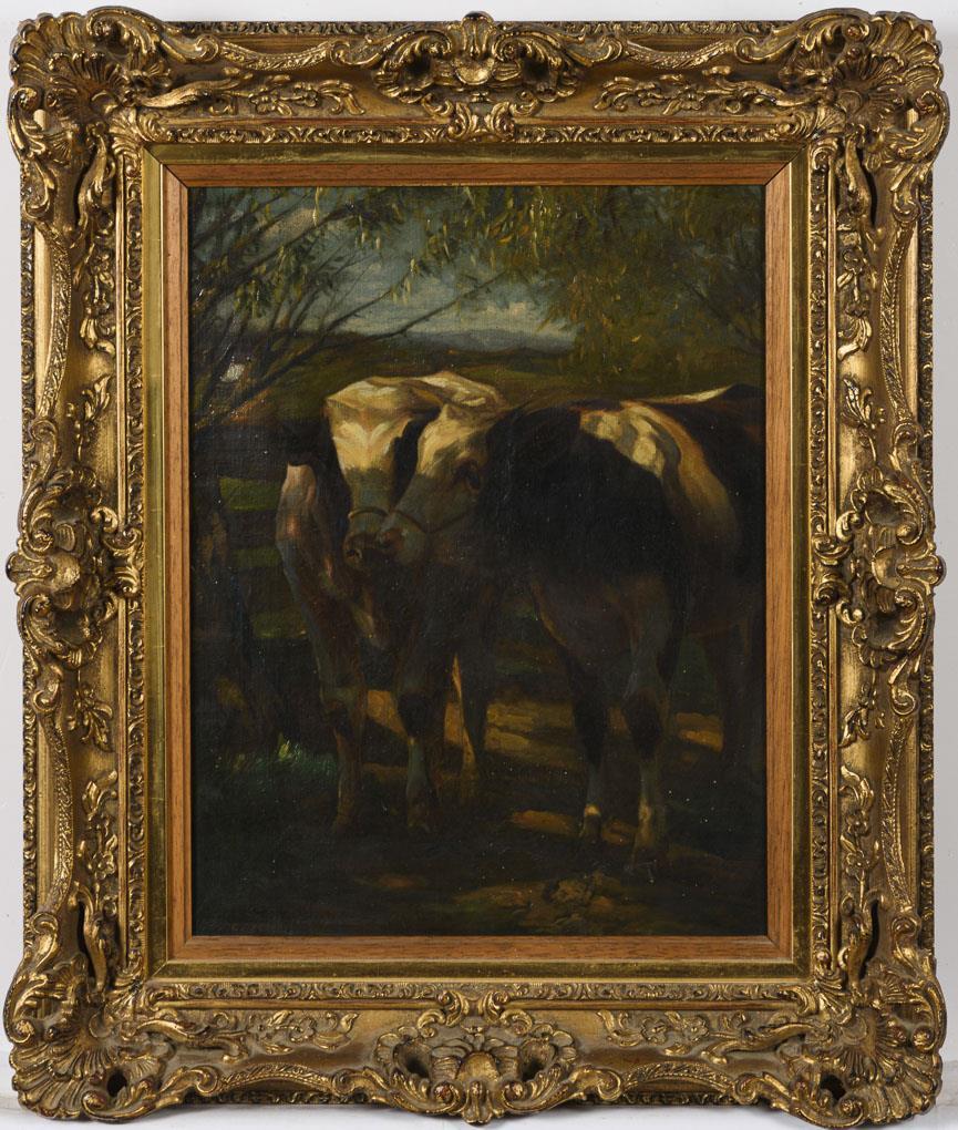 Die Tiere im warmen Licht am Zaun der Weide. Eine restaurierte Stelle mit Hinterklebung.
