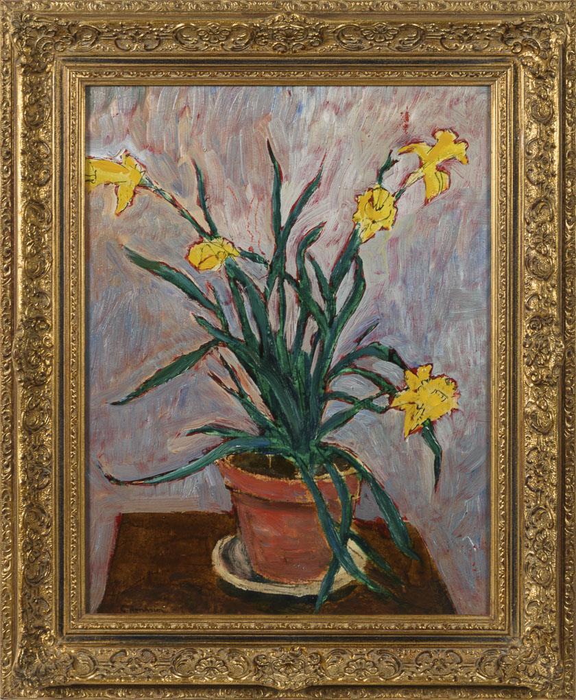 Die Blumen in einem Topf vor heller Wand.