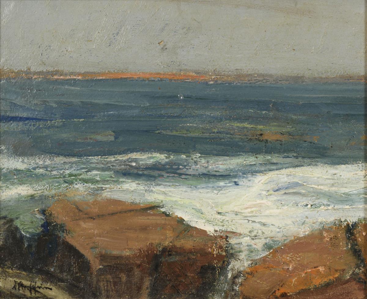 Küstenstudie mit große Felsen und Blick über die Bucht zum schematisch angedeuteten Ufer. Leichte Altersspuren.