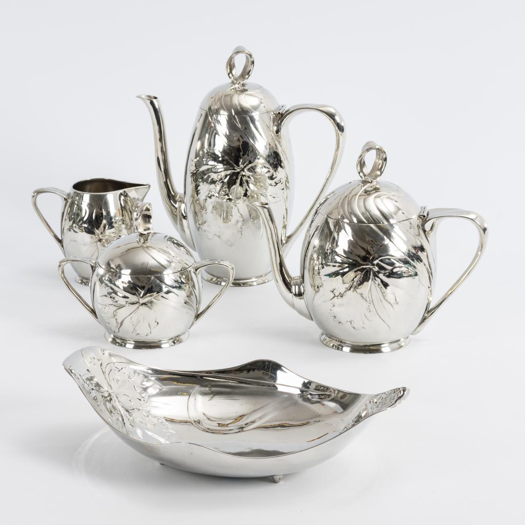 Gleichartig mit Iris reliefierte Kaffee- und Teekanne, Zuckerdose und Sahnekännchen. Ähnlich reliefierte Brotschale.
