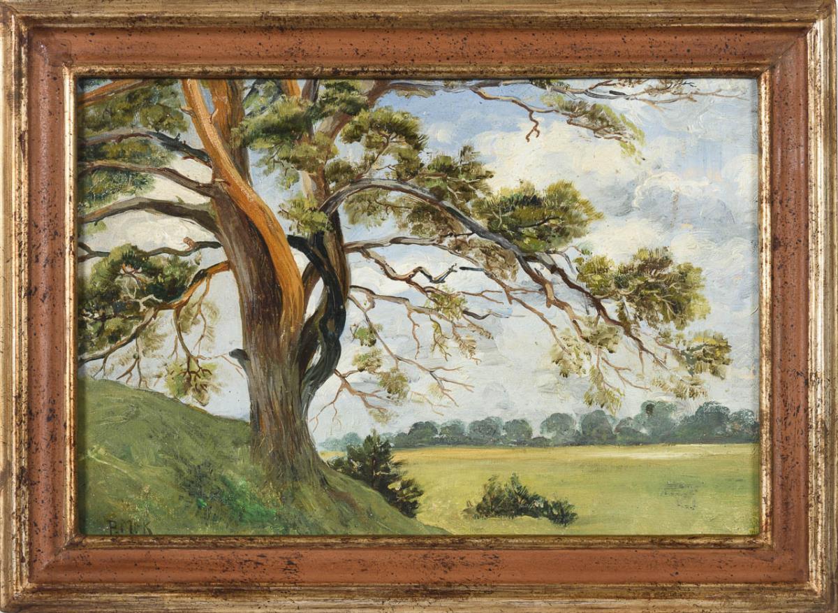 Weite Landschaft mit großem Baum an einem Hügel unter wolkigem Himmel.