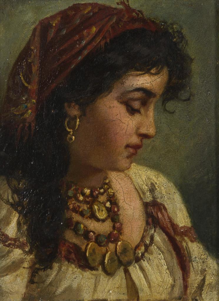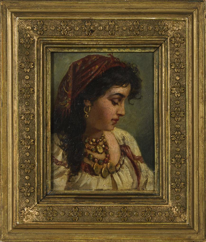 Bildnis einer jungen italienischen Frau mit rotem Kopftuch und großen Schmuckketten. Leichte Altersspuren.