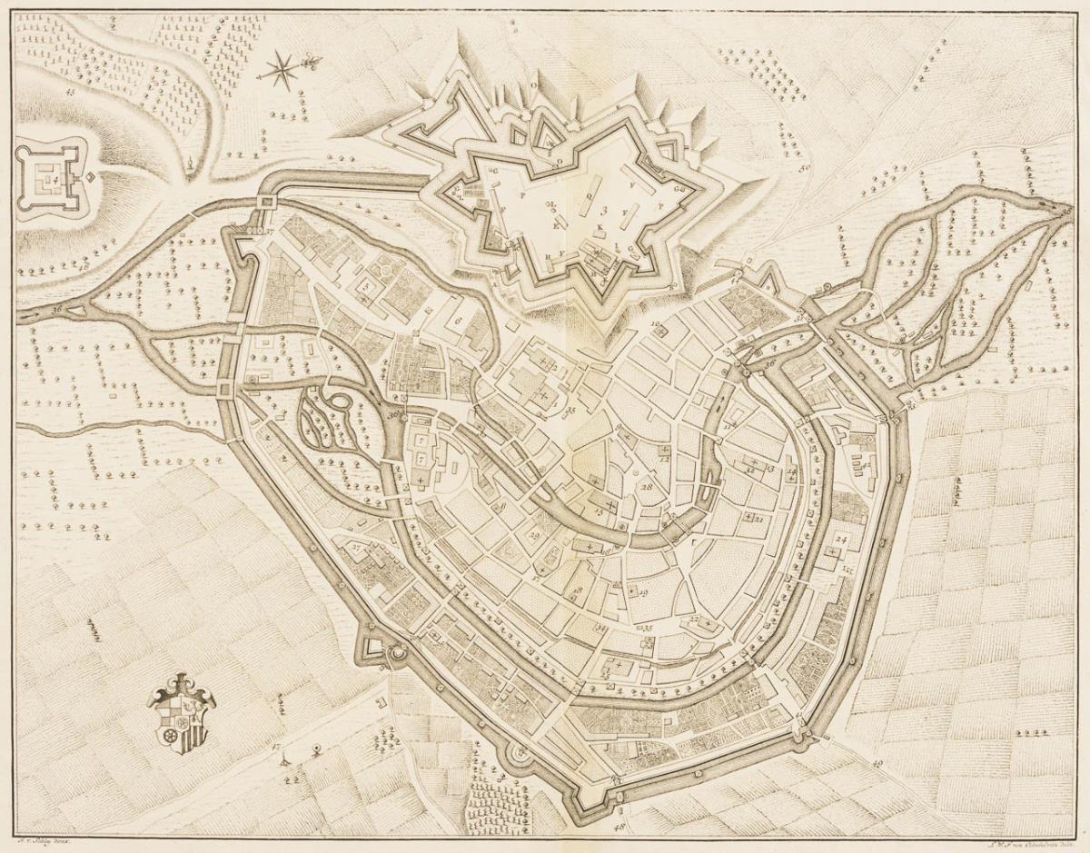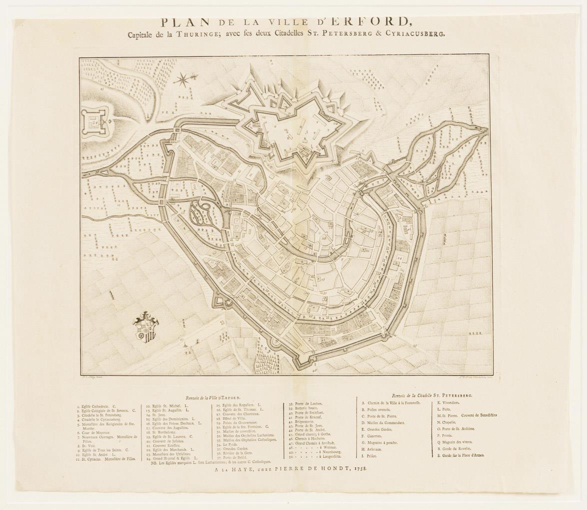 Landkarte der thüringischen Stadt Erfurt mit Legende: "Plan de la Ville d'Erford: Capitale de la Thuringe; avec ses deux Citadelles St. Petersberg & Cyriacusberg", gedruckt bei Pierre de Hondt 1758, nach einer Zeichnung von L.W.F. Oebschelwitz. An hinterklebter Bugfalte auf Karton montiert, verso am Rand etwas verschmutzt.